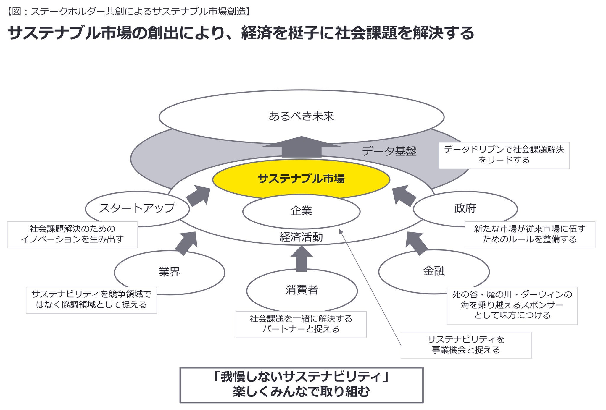 サステナブル市場創造に向けて最も避けるべきは、個社単独で挑戦することでしょう。個社単独での外部不経済の内部化は、事業に自ら足かせをはめるようなものです。単なるCSR的な活動ではなく、サステナビリティを通じて事業が「もうかる」ためには、さまざまなステークホルダーの協力を得ることが不可欠となります。