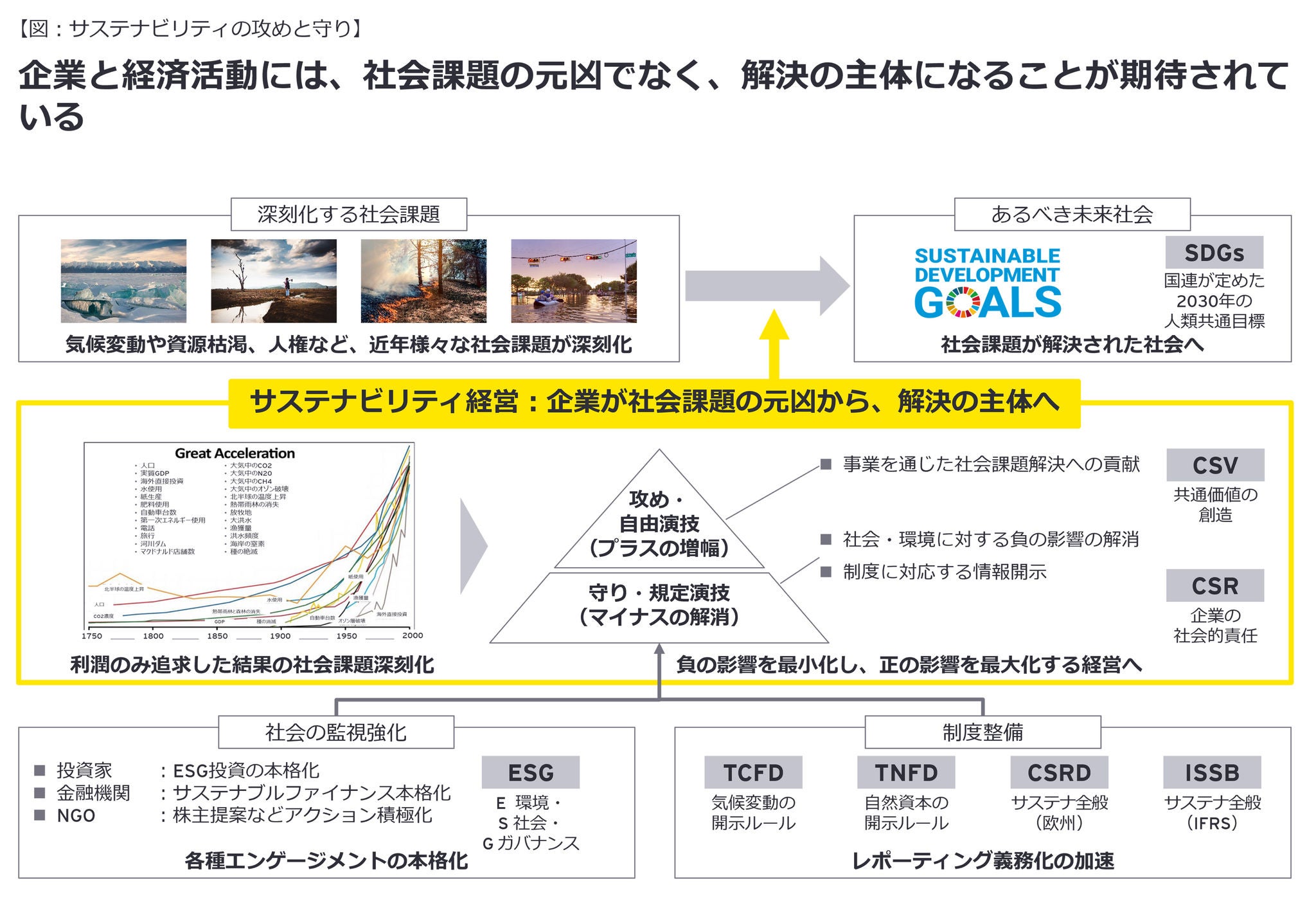 サステナビリティは、ポジティブな取り組みとして認識されるべきです。社会のあらゆるステークホルダーが協力してより良い社会をつくる、ワクワクする活動ではありませんか。企業が国際ルールの整備とステークホルダー要請の過熱への対応という守りのサステナビリティに終始していては、サステナビリティが義務的で抑制的で権威主義的な、暗たんとした概念として浸透することが懸念されます。