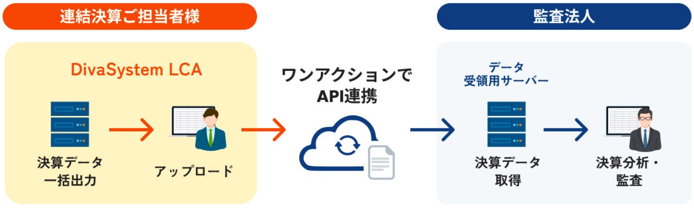 「DivaSystem LCA」を利用する連結決算ご担当者様が、監査調書の元データとなる決算データを一括出力し、EY新日本のデータ受領サーバーへワンアクションでAPIデータ連携を行います。