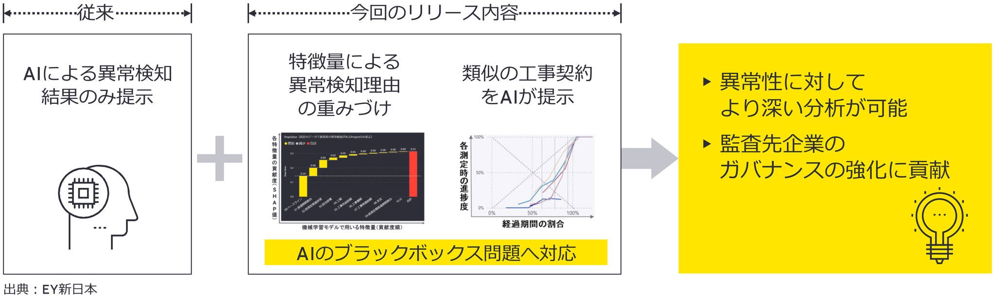 EY新日本では、進捗度に基づき一定期間にわたり収益を認識する方法(従来の工事進行基準)を適用している工事契約に関する監査手続において、AI/機械学習を用いて進捗度の予測を行い、不自然な進捗度の推移を検知するツール(以下、進捗度異常検知ツール)を開発・導入しています。すでにEY新日本は、同社が監査を担当する建設業7社の2022年3月期の監査報告書の「監査上の主要な検討事項(KAM)」の中で、「進捗度異常検知ツール」の活用に触れています。AI/機械学習の監査実務への活用が年々拡大するなかで、監査先企業へのアカウンタビリティを向上させることを目的としてXAIを用いた分析機能を追加しました。