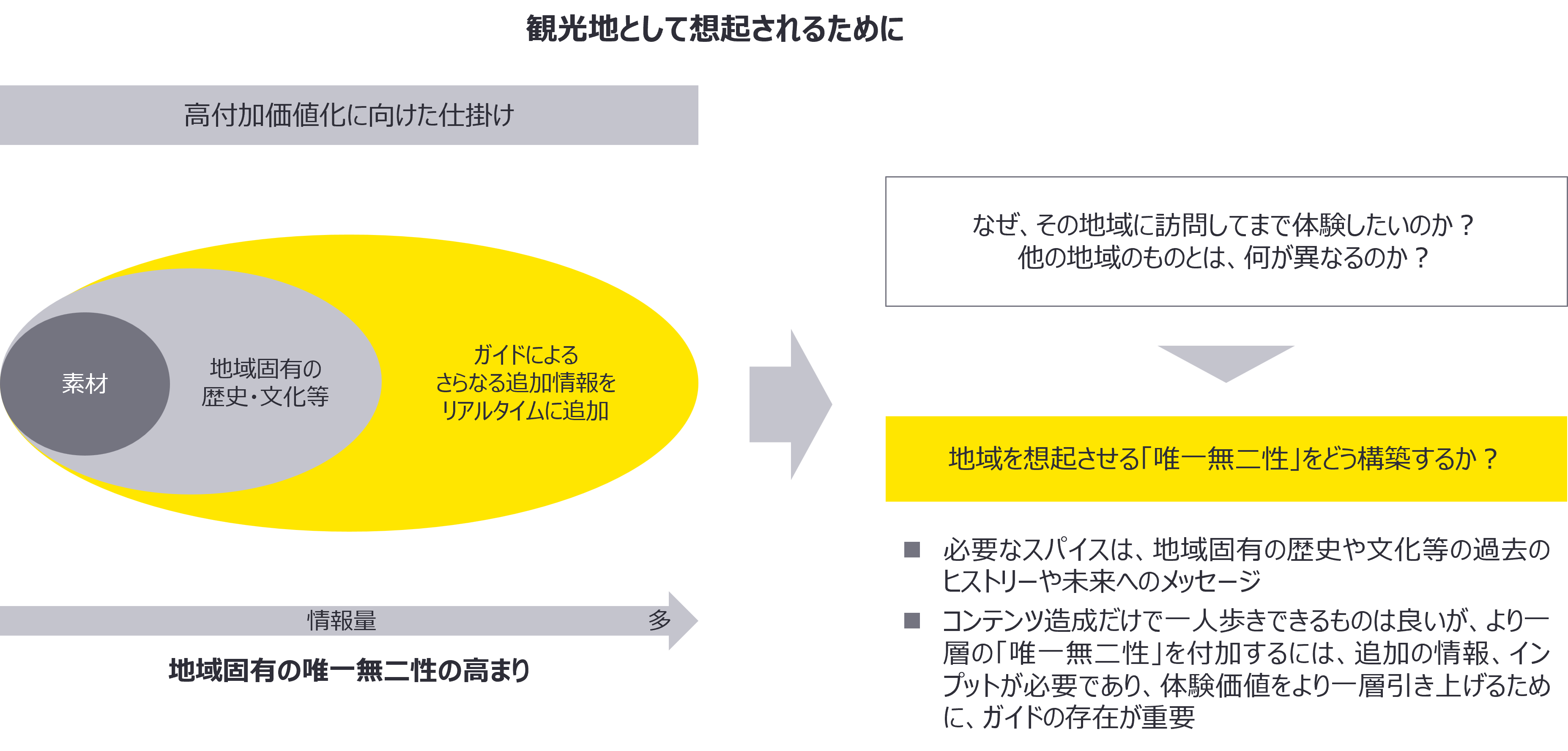 高付加価値化に向けて、他の地域にはない、唯一無二のコンテンツへと進化・深化させるためには、地域古来の歴史や文化の背景ストーリーを付加することが重要です。コンテンツにひもづく背景情報を、実際に現場で視覚的に見ながら、その場で耳から情報がインプットされると、理解は格段に高まり、当該コンテンツへと引き込まれていく可能性が高まります。ガイドの役割も重要で、単に補足説明するだけでなく、さまざまな地域のコンテンツを束ねて高付加価値旅行者の意に沿うようなアレンジを加えることが求められます。
