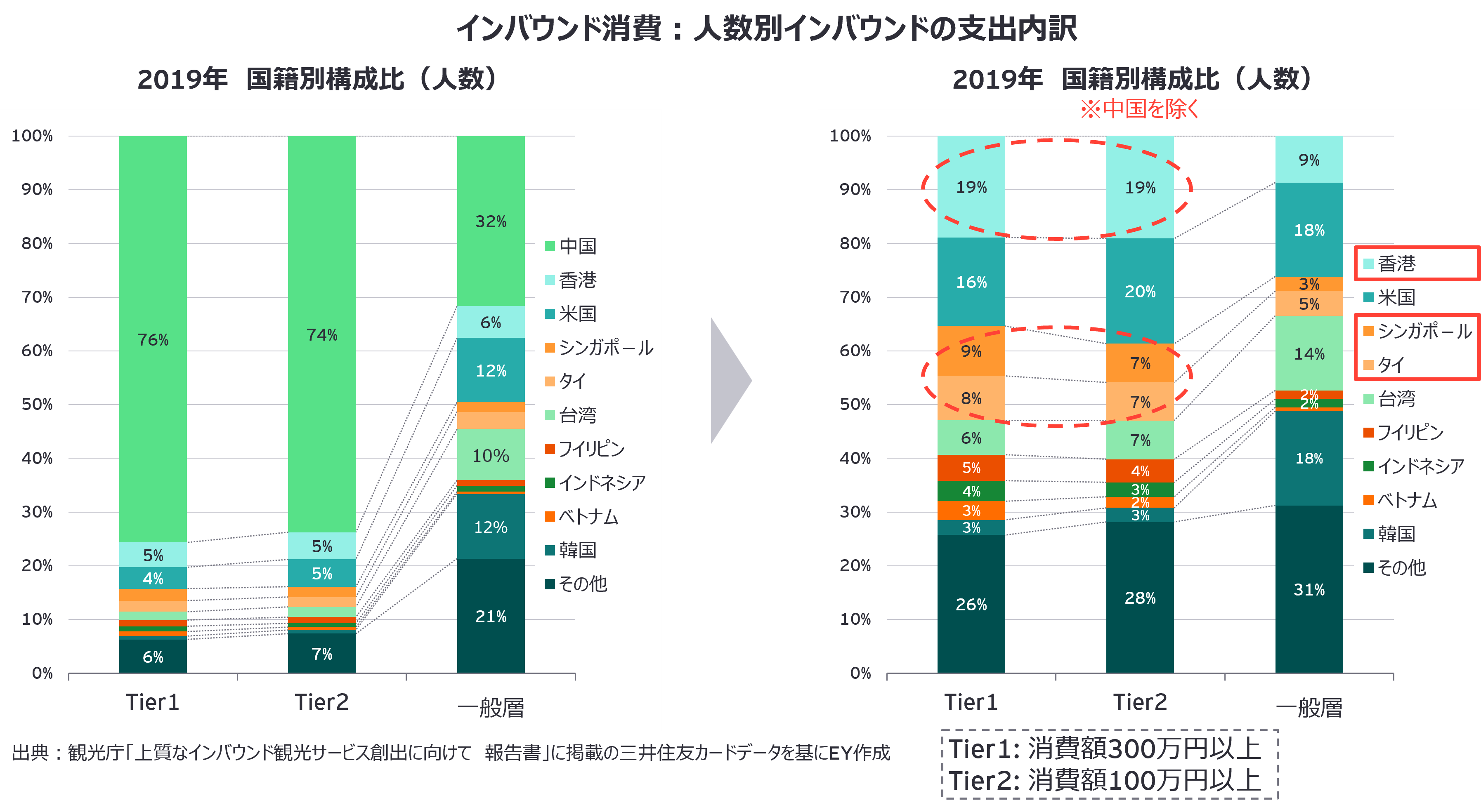 日本政府観光局(JNTO)は、訪日旅行1回あたりの総消費額が1人100万円以上の旅行者を「高付加価値旅行者」と定義しています。2019年のデータによると、訪日インバウンドの平均消費単価は60千円ですが、300万円以上消費した旅行者(Tier1)の平均消費単価は6,313千円に達しています。現在は円安の影響で、消費額はさらに高額になっていると考えられます。国籍別では、中国が圧倒的に多く、次いで香港、シンガポール、タイ、米国からの旅行者が多くなっています。消費の内訳を見ると、貴金属・時計や百貨店、衣服ブランドメーカーが上位を占めていますが、Tier1ではアートなどの地域製品も含まれています。