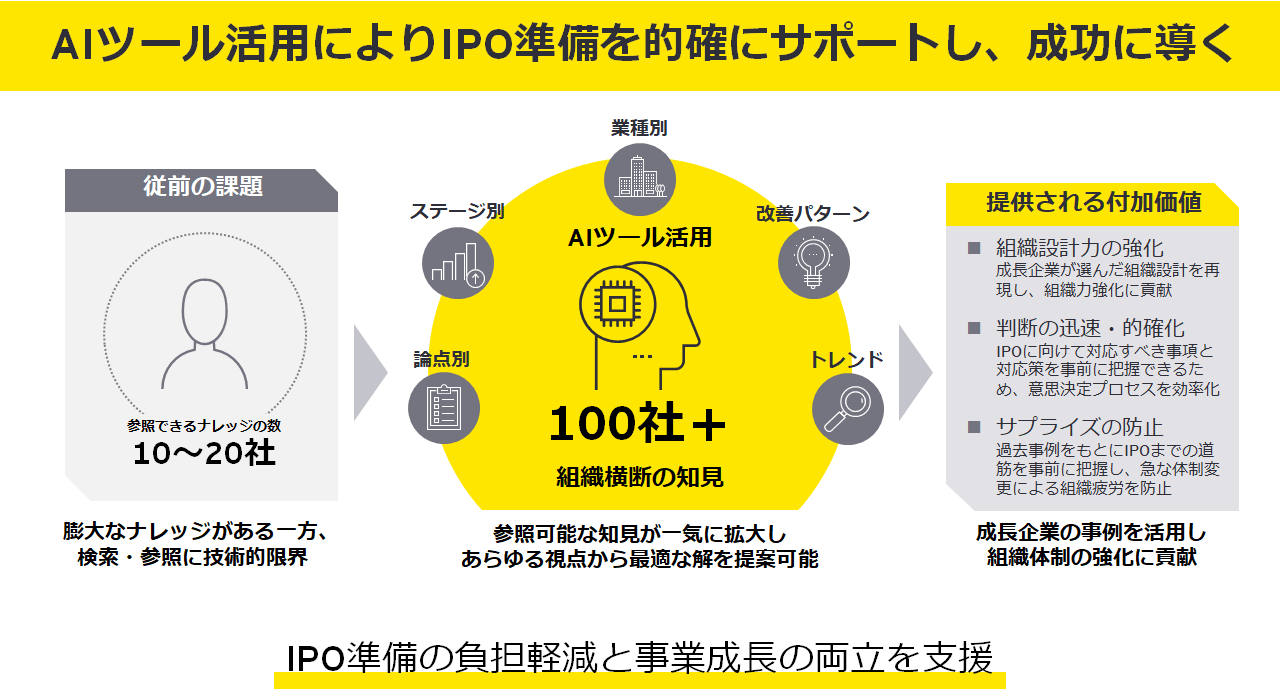 EY新日本は、5年累計で国内トップとなるIPO監査実績や、幅広い業種・成長段階のスタートアップ支援を通じて蓄積してきた知見を、AI技術により体系化・活用することで、IPO準備における情報や判断の整理をサポートし、事業成長に集中できる環境の整備を目指しています。 近年、制度や市場環境の変化によりIPO支援に求められる視点は多様化していますが、EY新日本はAI技術の活用を通じて、こうした変化に柔軟に対応しながら、より高品質で再現性のある支援を継続的に提供し、健全な挑戦が生まれやすいスタートアップエコシステムの形成に貢献していきます。