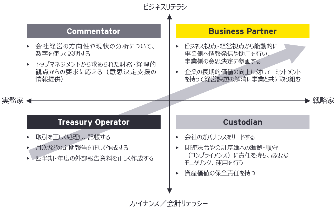 長期的価値創出と社会課題解決によるサステナブルな成長というCFOの新たなミッション遂行のためにファイナンス組織はそのケイパビリティを大きく転換させ、経理処理や財務報告を正しく行うことにフォーカスした従来のScore Keeperからビジネス視点で事業側の意思決定に参画するBusiness Partnerへとその役割を進化させる必要があります。