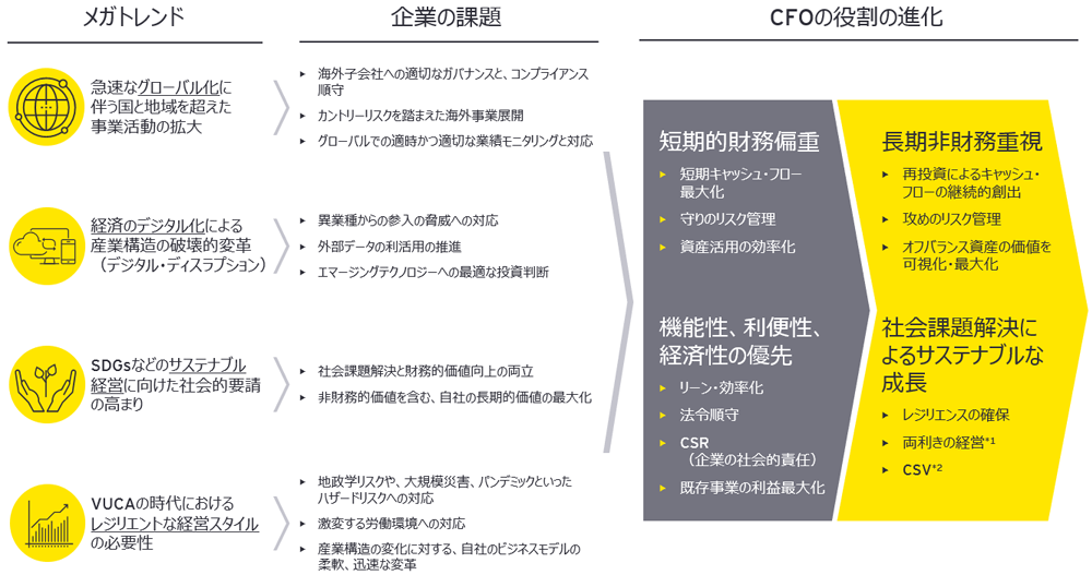 社会経済に構造的な変化をもたらす大きな潮流(メガトレンド)は企業にとってこれまでにない複雑な課題を生み出すと同時に成長の機会を提供しています。そうした中、CFOは従来のような短期的な利潤や効率性の追求にとどまらず、非財務を含めた長期的価値創出をリードし、社会課題解決を通じてサステナブルな成長を可能とする経営を実現することが求められています。