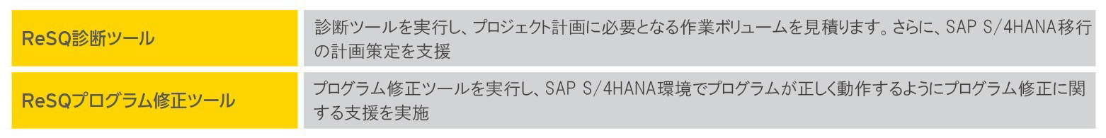 EYは独自のSAP S/4HANAへの移行診断およびプログラム修正ツールである“ReSQ ”を保持しています。 このツールを活用することで、短期間かつ安全なSAP S/4HANAへの移行を支援することが可能です。
