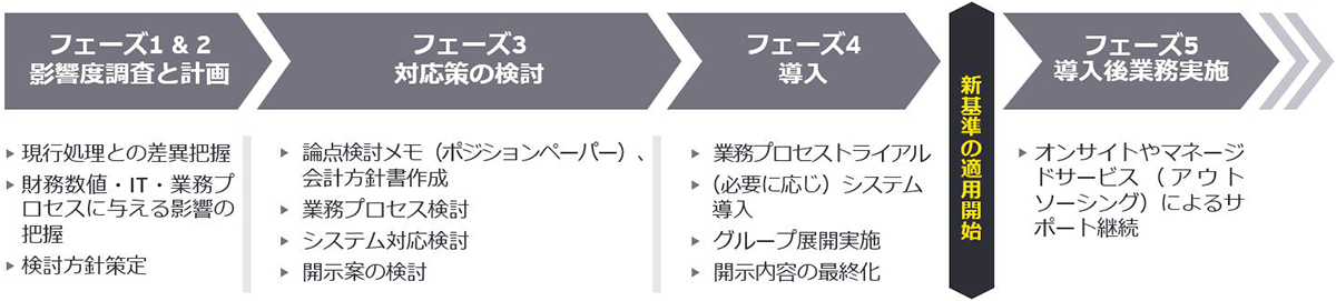 基準適用後においても、新しい業務プロセスを継続して運用していくためのリソースの確保や社内ルールの標準化、会計処理や開示のために情報収集などを行うことが考えられます(フェーズ5)。
