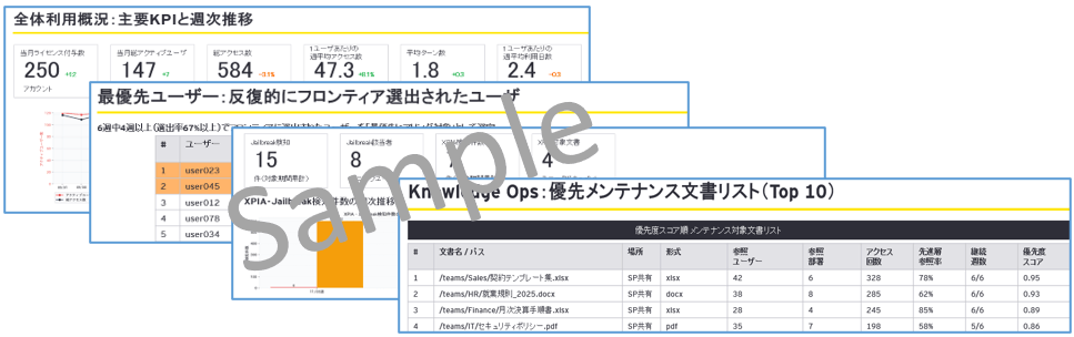 生成AIが実際に参照している社内文書を特定し、情報資産整備の優先順位付けを支援します。参照文書の質が生成AIの回答品質に直結するため、監査ログを根拠にした文書整備が組織全体の生成AI活用水準を底上げします。