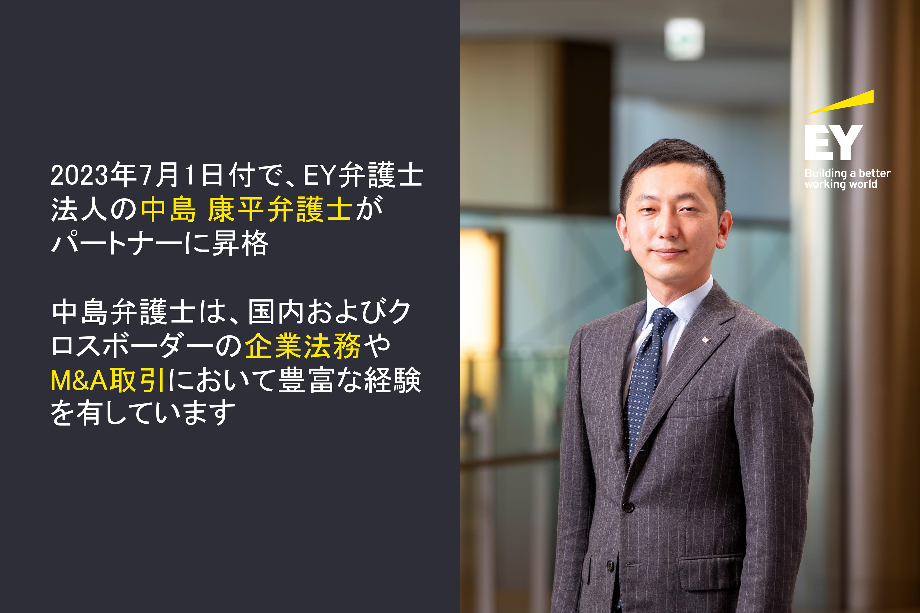 EY弁護士法人は、2023年7月1日付で、中島 康平弁護士がパートナーに昇格したことをお知らせいたします。中島弁護士は、国内およびクロスボーダーの企業法務やM&A取引において豊富な経験を有しています。