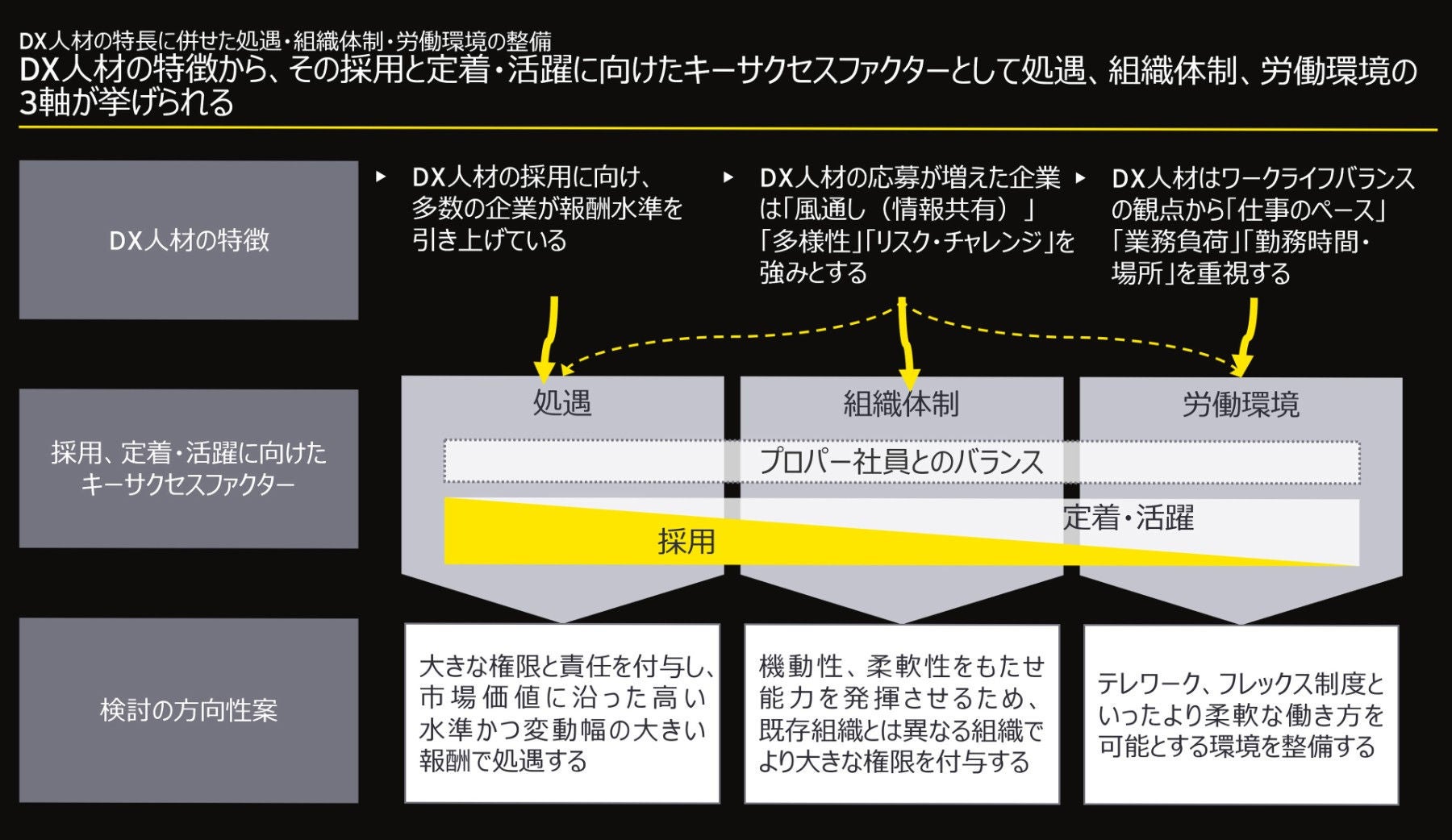 せっかくDX人材を育成しても、外部に流出をしてしまっては人材への投資が無駄になってしまうことから、DX人材が働きやすい環境を構築し定着をさせることが育成と同じく必要となります。具体的には、DX人材が定着・活躍するために3つの軸(処遇・組織体制・労働環境)の観点で整備します。