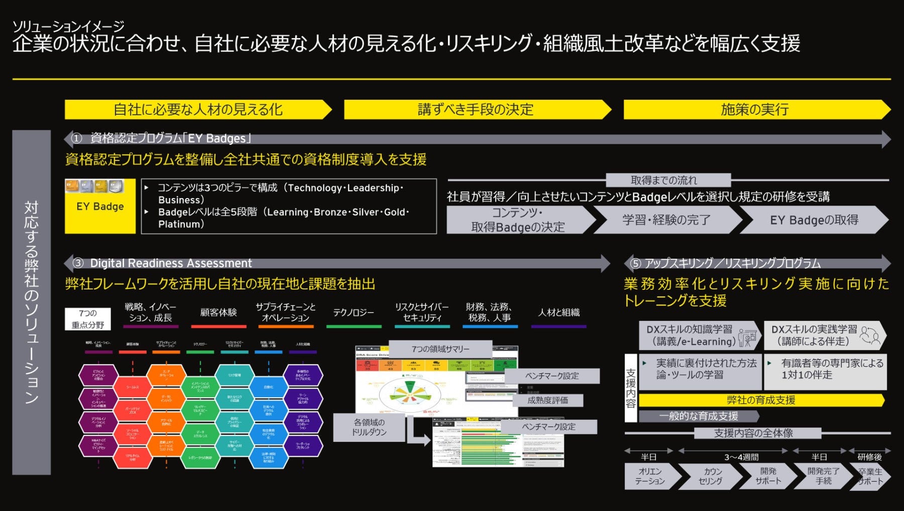 前段で説明したプロセスをまたぐソリューションとしては、全社共通の資格認定プログラム「EY Badges」が挙げられます。具体的には、DXを推進する上で必要な要素を定義の上、資格認定プログラムを整備し、DX人材の育成に取り組んでいます。