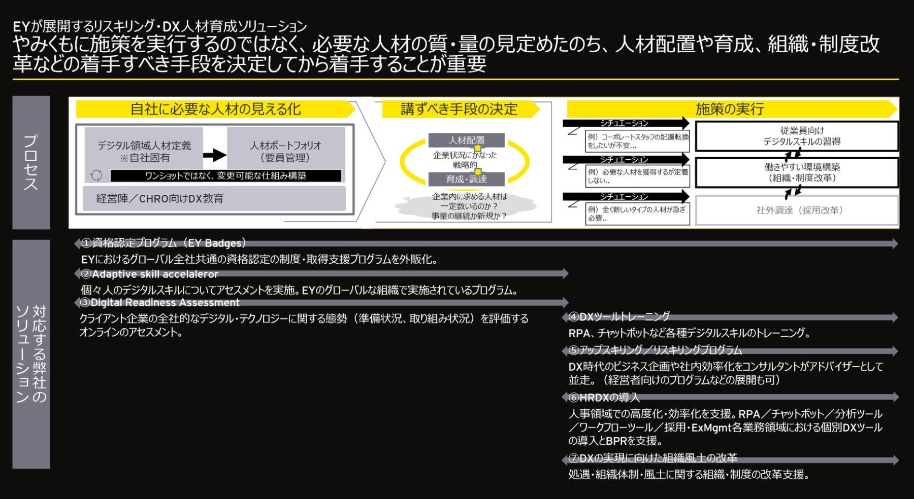EYが展開するDX人材育成ソリューションでは企業の状況に合わせ、自社に必要な人材の見える化・リスキリング・組織風土改革など幅広く支援が可能です。