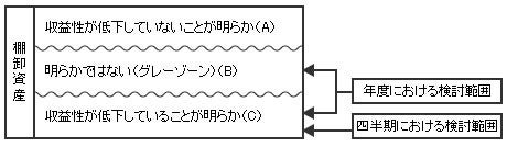 「棚卸資産の評価に関する会計基準」では、実務上、収益性が低下していないことが明らかな棚卸資産については、正味売却価額を見積もる必要がないとしています。一方、四半期会計基準では、収益性が低下していることが明らかな棚卸資産についてのみ正味売却価額を見積もり、簿価切り下げを行うことができるとしています。従って、年度における正味売却価額を見積もる対象は、【図表3】の(B)+(C)であるのに対し、四半期における対象は(C)のみとすることができます。