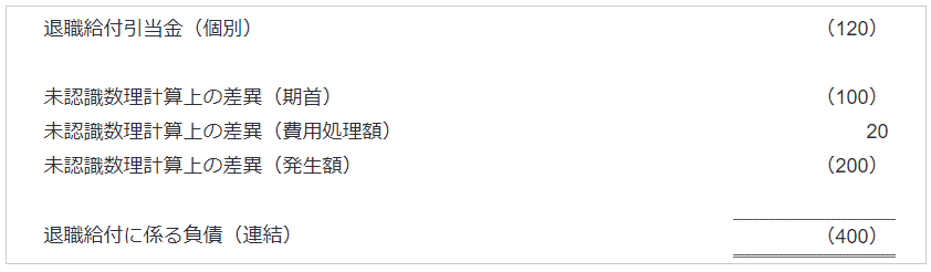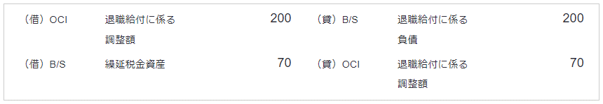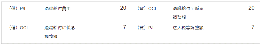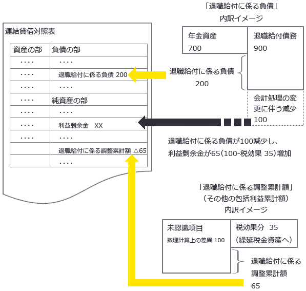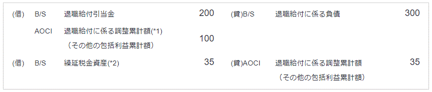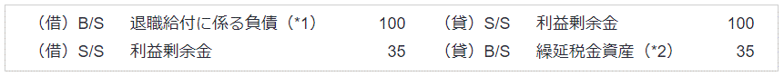 (注)個別財務諸表上で退職給付引当金に係る繰延税金資産を計上している場合、上記仕訳の退職給付引当金20に係る繰延税金資産7(=20×35%)を併せて振戻すことになると考えられます。