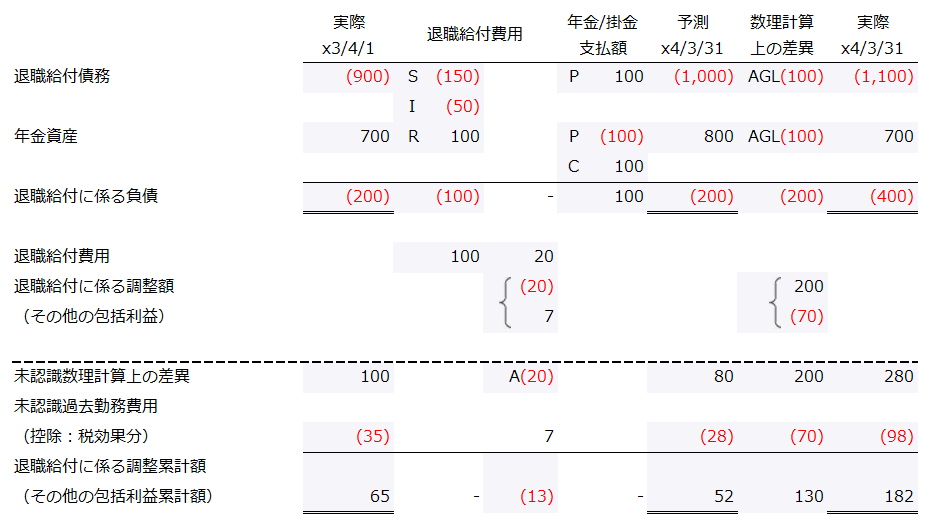 ② 数理計算上の差異の費用処理については、当期の発生額を翌期から費用処理期間5年の定額法(0.200)で費用処理する方法を採用(X3/4/1の未認識数理計算上の差異100は、全額がX3/3/31期に発生)