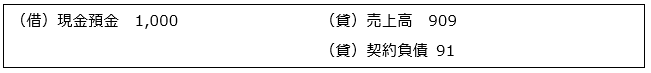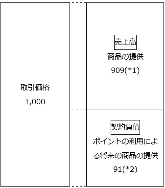 例えば、取引価格が1,000、将来ポイントの利用が見込まれる部分が100の場合、独立販売価格の比率に基づき、以下のように配分します。