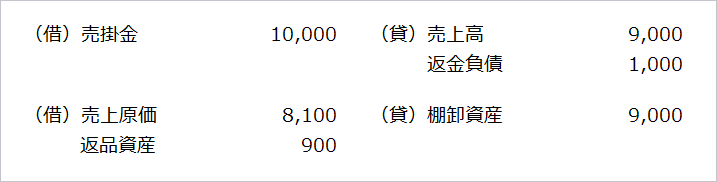 売上高10,000のうち返品率10%が見込まれ、売上総利益率が10%である場合には、以下の仕訳が行われます。