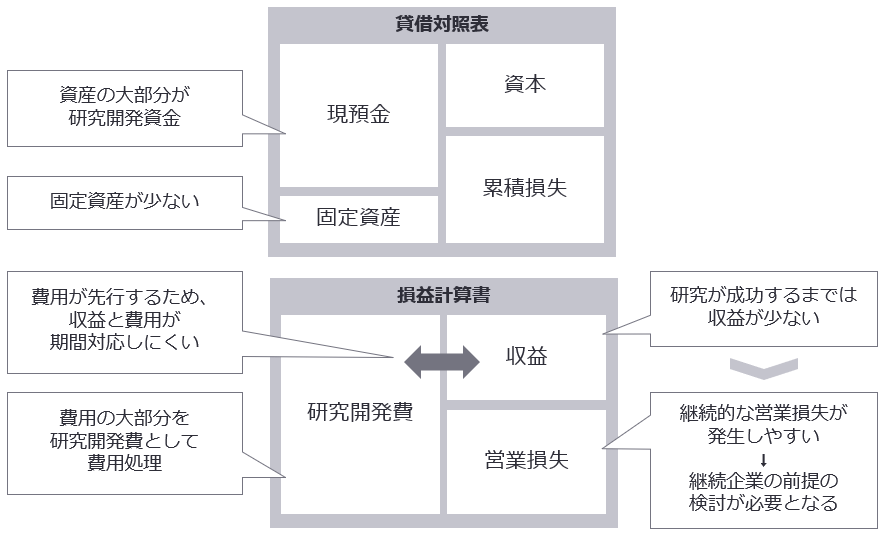 バイオベンチャー企業は、ベンチャーキャピタル等からの出資や公的助成金で得た資金などを主に現預金として保有し、研究開発に使用します。しかし、安定した収益源がなく、事業収益の獲得に比して研究開発費の支出が先行するため、継続的な営業赤字が発生しやすいといえます。このようなビジネス形態からバイオベンチャー企業の財務諸表には、次のような特徴があります。