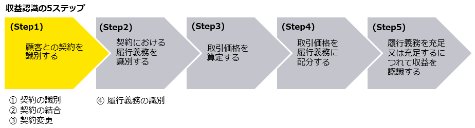 はじめに、定められた5要件を満たしたものについて契約を識別します(①契約の識別)。識別された契約のうち、複数でも実質的には単一の契約と判断される要件を満たしたものについては、単一の契約とみなします(②契約の結合)。また、契約変更がある場合には、変更される内容等に応じて、既存契約の変更として処理するか、別個の契約として処理するかの判断を行います(③契約変更)。