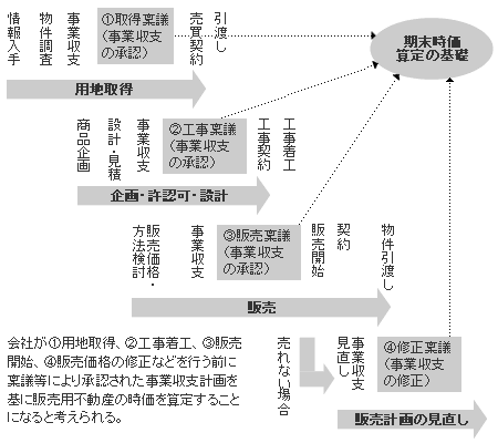 一般的に、土地の取得前、建築工事依頼前、販売開始前などの時点で収支計画が作成・見直され、実績との比較分析が行われます。販売用不動産の評価は今後の販売見込額、原価発生見込額や販売経費の発生見込額を勘案して行われるため、市況の変化による販売見込額の変動、工事の遅れやそれに伴う販売の遅れは原価や経費の増加を招き、評価減につながりますので注意が必要です。適時な見直しのためには、管理部門がプロジェクトチームと綿密なコミュニケーションをとり、これらの変更の事実だけでなく、変更の可能性について、適時に情報を収集する仕組みができているかが重要です。