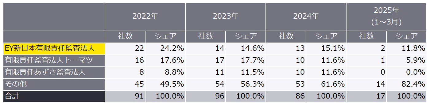 監査法人別では、EY新日本有限責任監査法人2社(11.8%)、有限責任監査法人トーマツ1社(5.9%)、となり大手法人合計で全体の2程度、中小規模等のその他の監査法人の割合が増加しており、新規上場において担う役割が大きくなってきていることがうかがえます(表4)。