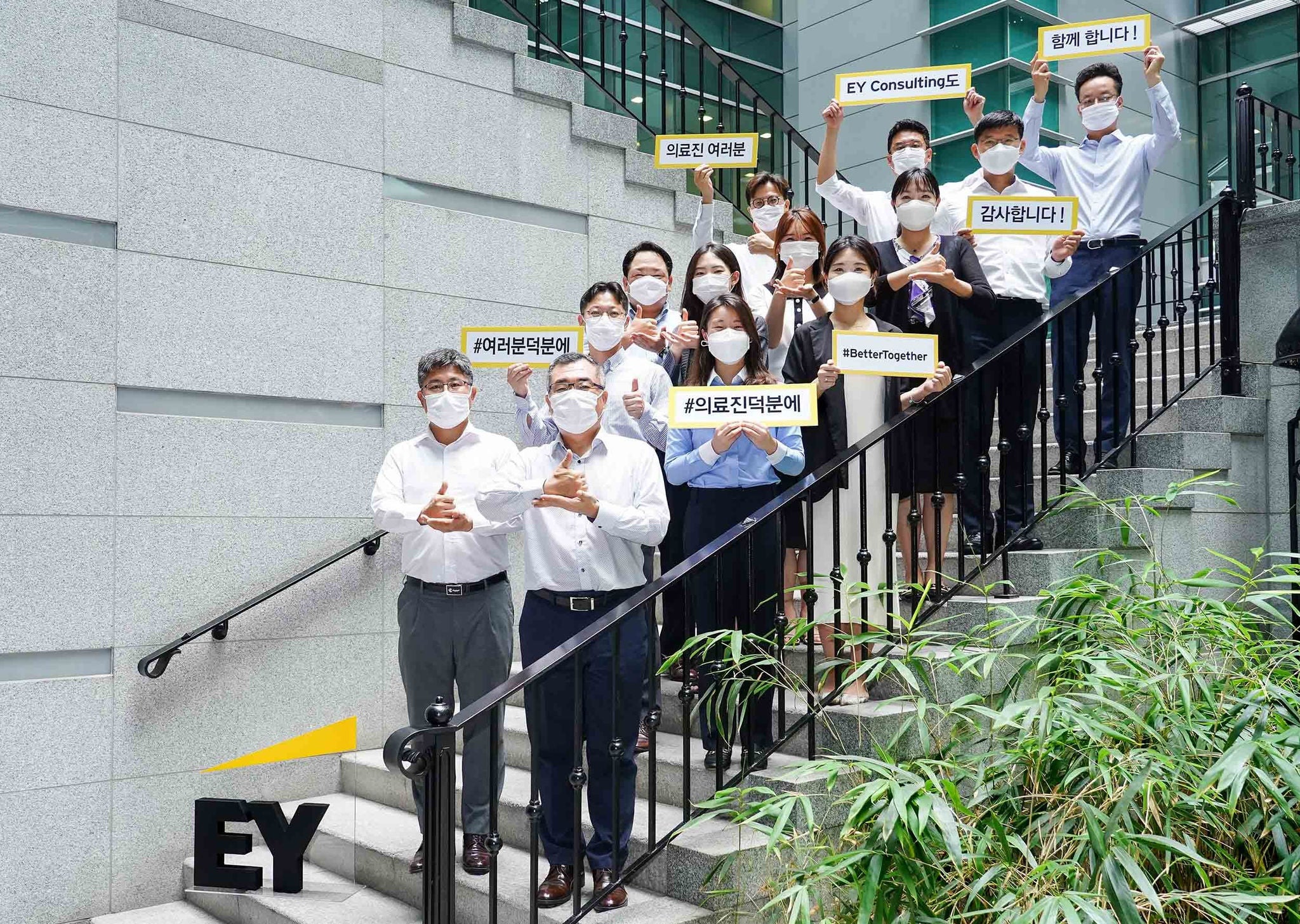 김정욱 EY컨설팅 대표(맨 앞줄 왼쪽에서 둘째)와 EY컨설팅 임직원들이 코로나19를 위해 헌신하고 있는 의료진들에게 응원의 메시지를 전하기 위해 ‘덕분에 챌랜지’에 동참하며 사진촬영을 하고 있다.