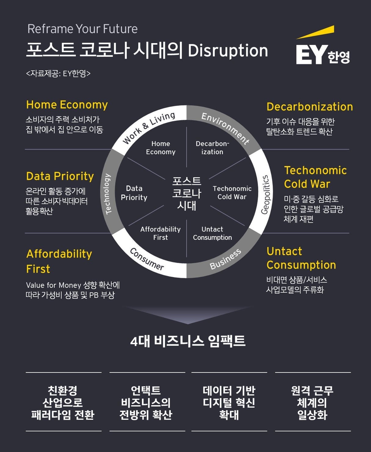 이어서 ‘팬데믹 시대의 경영환경 변화와 기업의 대응전략’ 발표에 나선 변준영 EY-파르테논 APAC 전략 컨설팅 리더 겸 EY한영 산업연구원장은 “포스트 코로나 시대의 파괴적 혁신을 6개 유형으로 분류할 수 있다”고 말했다. 6대 파괴적 혁신은 ▲홈 이코노미(Home Economy)의 부상 ▲탈탄소화 트렌드 확산 ▲ 데이터 중요성 확대 ▲테코노믹(Techonomic) 냉전 ▲’가성비’ 소비 확산 ▲비대면 상품/서비스 주류화 등이다.