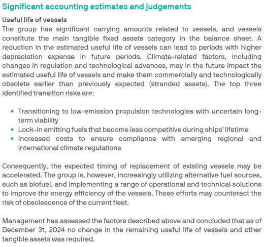 Regnskapsmessige områder som forventes å kunne bli påvirket av klimarisiko og klimarelaterte forhold er opplysninger om estimater og skjønnsmessige vurderinger, driftsmidler, nedskrivninger, avsetninger, betingede forpliktelser og betingede eiendeler, virkelig-verdi-måling, finansielle instrumenter, karbonkreditter og sertifikater for fornybar energi og kraftkjøpsavtaler (PPA-er). For eksempel kan klimaendringer påvirke både verdien på et anleggsmiddel, utnyttbar levetid og gjenvinnbart beløp. Noen teknologier kan bli faset ut gjennom ny lovgivning, eller at fornybar teknologi blir mer konkurransedyktig med tanke på pris på grunn av bratt læringskurve og investeringer i forskning og utvikling. Andre eiendeler kan være utsatt for skade fra ekstremvær.