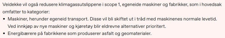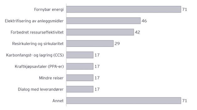 Opplysninger om tiltak for å redusere klimautslipp, både allerede igangsatte og planlagte, opplyses om som en del av omstillingsplanene. Selskapene har gitt selskapsspesifikke opplysninger, men enkelte tiltakstyper går igjen hos mange selskaper. Det vanligste tiltaket var økt bruk av fornybar energi (syv av ti), gjennom for eksempel kjøp av opprinnelsesgarantier, egenproduksjon av fornybar elektrisitet og bruk av fornybart drivstoff til transport. Et annet vanlig tiltak, opplyst om av omtrent halvparten av selskapene, var elektrifisering av anleggsmidler. Flere selskaper har også fremhevet forbedret ressurseffektivitet, sirkularitet i produkter gjennom resirkulering og gjenbruk, kraftkjøpsavtaler, karbonfangst- og lagring, redusert reiseaktivitet, dialog med leverandører, samt digitalisering, som tiltak for å redusere utslipp.