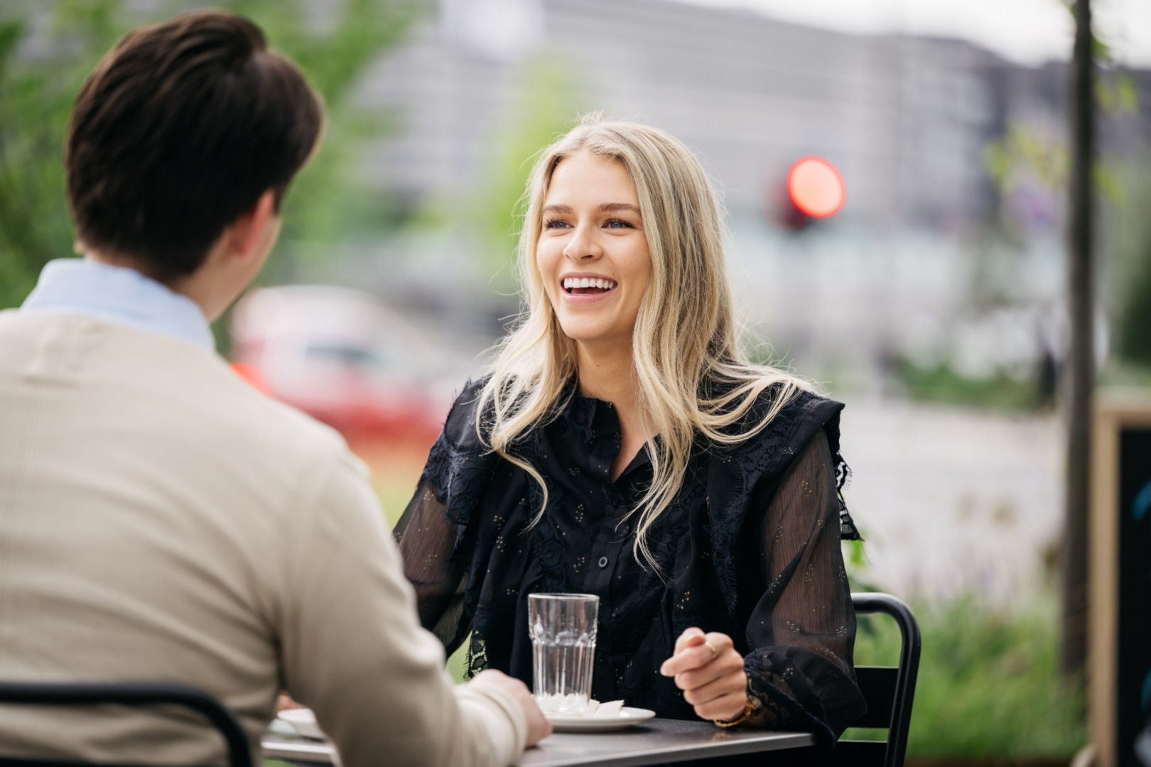 Bilde av tre EY-kollegaer som diskuterer og jobber sammen med Barcode i Oslo i bakgrunn.