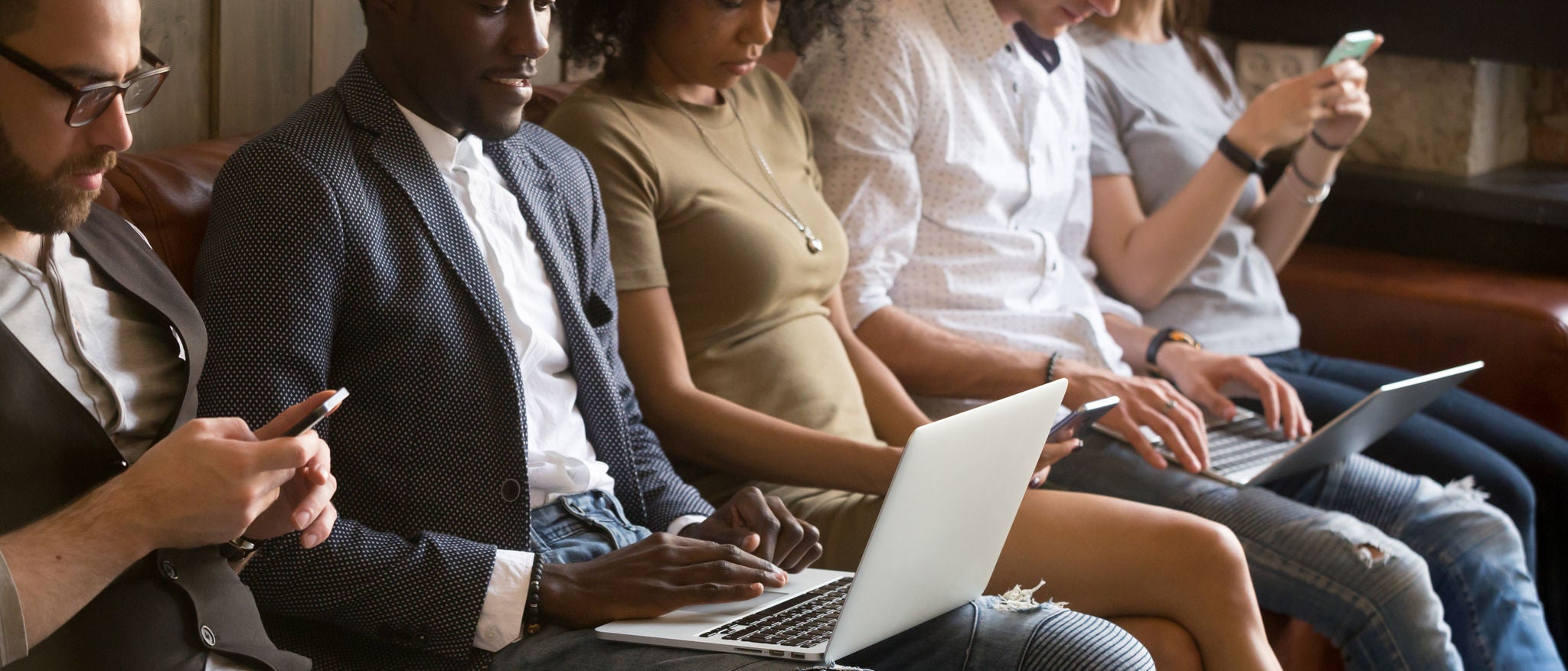 Close up of diverse young people being addicted to gadgets, sitting in queue using phones and laptops, multiracial millennials busy chatting or checking email on smartphones, obsessed with technology