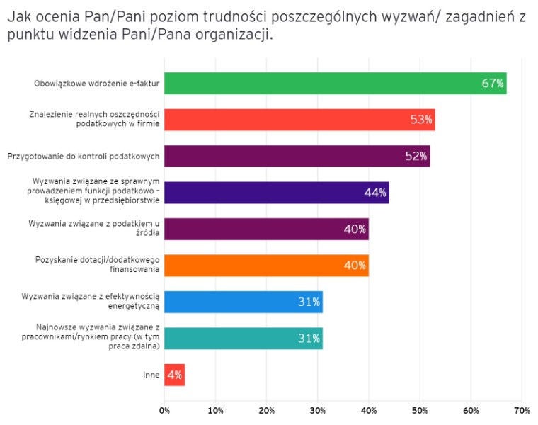 W odmienny sposób potencjalne wyzwania oceniają średnie firmy (zatrudniające do 249 pracowników). Wyniki przeprowadzonego badania pokazują, że najtrudniejszym wyzwaniem wśród tych organizacji jest poszukiwanie realnych oszczędności podatkowych w firmie. Uznało tak 44% respondentów (oznaczając poziom trudności tego wyzwania na poziomie 4 lub 5, czyli poziomie bardzo wysokim). 37% badanych wskazało na wyzwania związane ze sprawnym prowadzeniem funkcji podatkowo–księgowej w przedsiębiorstwie, a tylko 35% ankietowanych uznało, że wdrożenie obowiązkowych e-Faktur stanowić będzie dla średnich firm duże wyzwanie. Na dalszym miejscu respondenci wymienili również wyzwania związane z podatkiem u źródła (35%), najnowsze wyzwania związane z pracownikami/rynkiem pracy (w tym praca zdalna) oraz z efektywnością energetyczną – 33% respondentów.