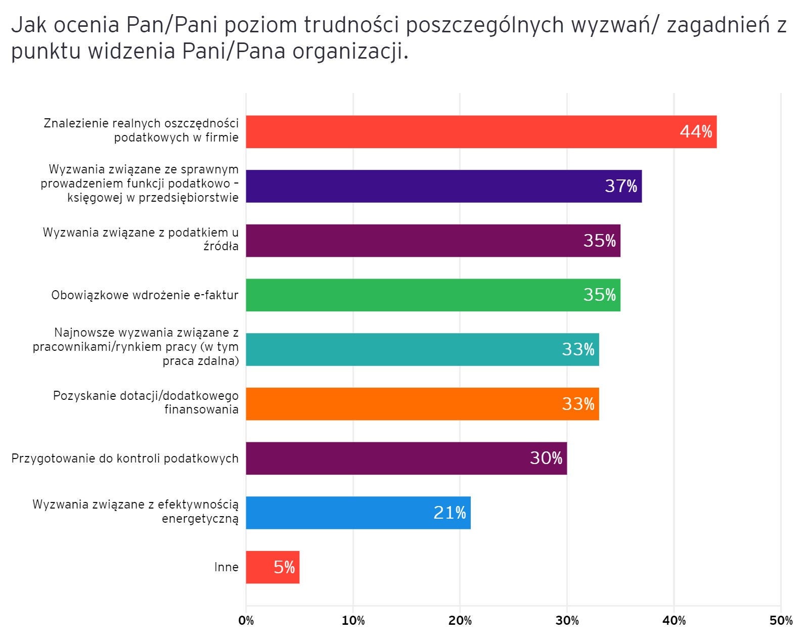 Badanie EY pokazuje również, że dla tej grupy ankietowanych innym istotnym wyzwaniem w bieżącym roku jest znalezienie realnych oszczędności podatkowych w firmie. Uznało tak 53% respondentów, a na podobnym poziomie (52%) respondenci wskazali przygotowanie do kontroli podatkowych oraz sprawne prowadzenie funkcji podatkowo-księgowej w przedsiębiorstwie (44%).