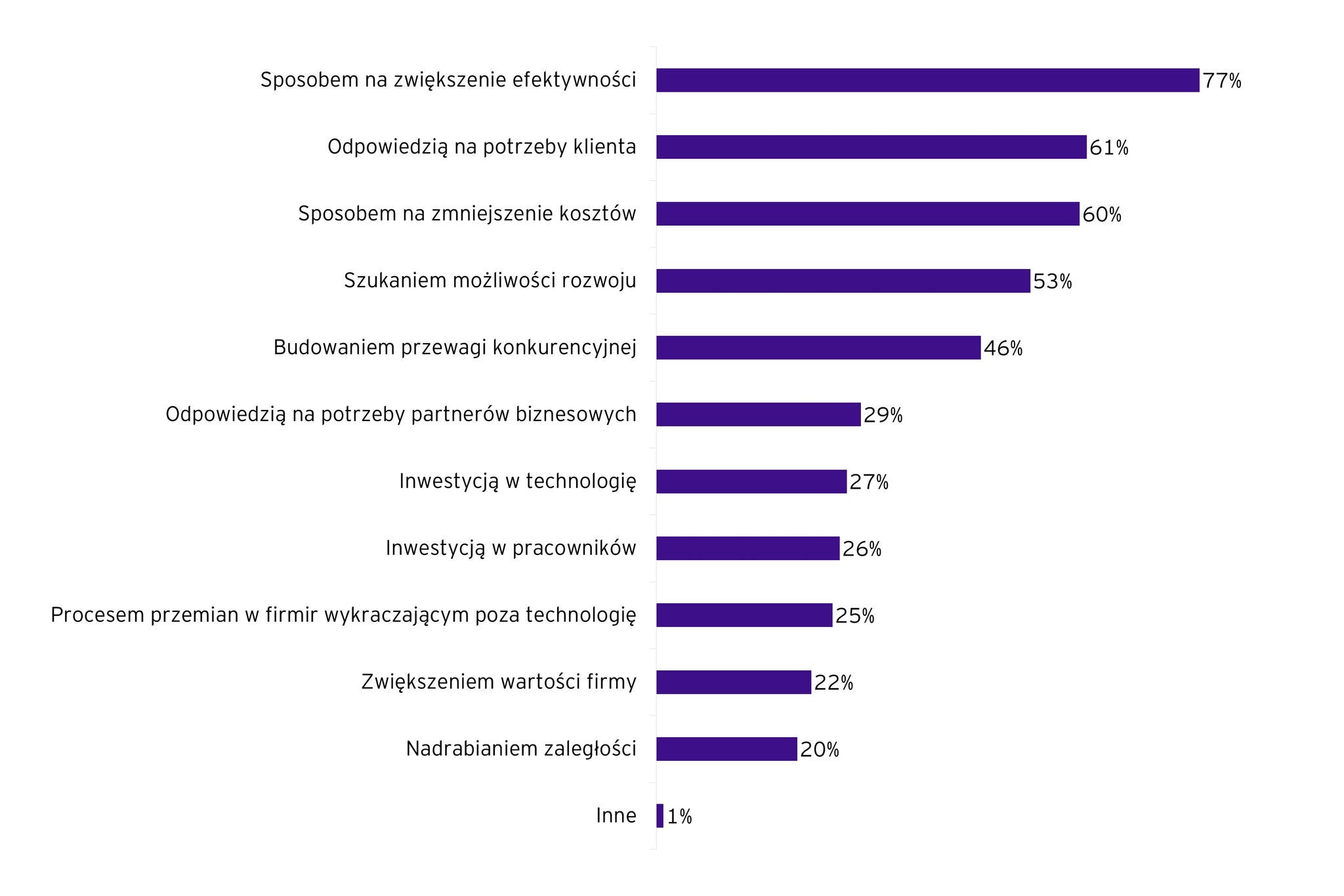 Uczestnicy sondażu zostali również zapytani o procent budżetu jaki przeznaczają rocznie na transformację cyfrową. Ponad połowa respondentów zadeklarowała, że ich firma przeznacza na ten cel do 3% przychodu, a około jednej czwartej, iż 4–5% z zysku. Mniej, bo poniżej jednej dziesiątej ankietowanych, przekazuje 6 – 10% przychodu, a powyżej 10% przychodu 8% badanych.