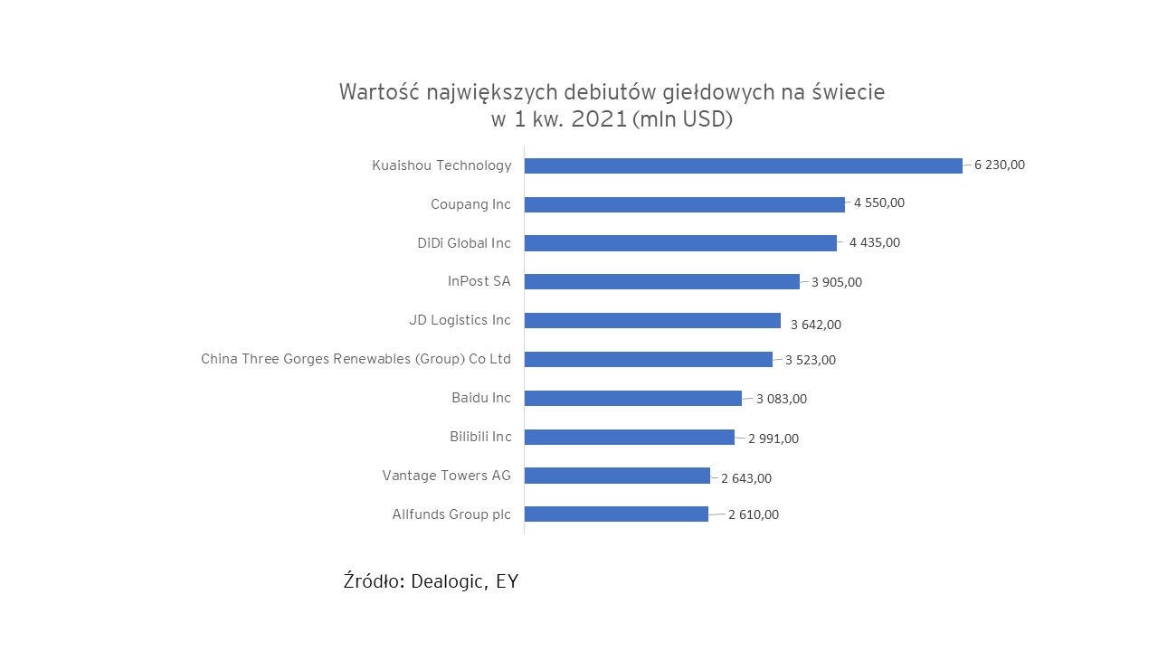 W drugim kwartale 2021 r. zadebiutowało 597 spółek na rynkach światowych, a wartość debiutów wyniosła 111,6 mld USD – wynika z najnowszej edycji badania EY Global IPO Trends. To był najbardziej aktywny drugi kwartał na rynku pierwotnych ofert publicznych (IPO) w ciągu ostatnich 20 lat, przewyższając poprzedni rekord z 2007 r. (gdy zadebiutowało 522 firm a wartość IPOs wyniosła 87,7 mld USD). W ciągu sześciu miesięcy 2021 r. zadebiutowało 1 070 firm, a wartość debiutów wyniosła 222,0 mld USD, co oznacza wzrost odpowiednio o 150% i 215% rok do roku.