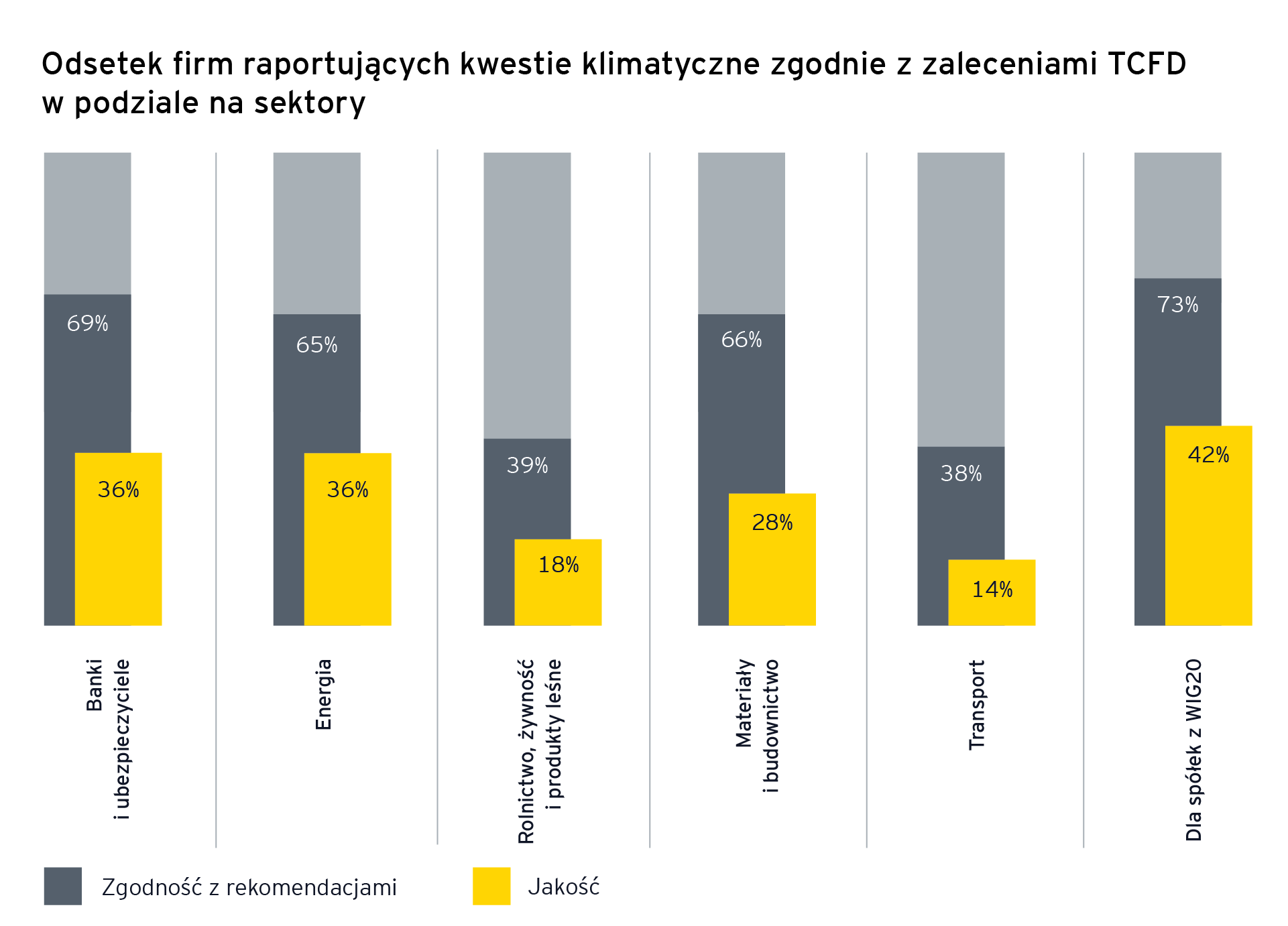 Patrząc na wyniki badania EY Polska przez pryzmat sektorów działalności spółek, najlepiej do zaleceń sprawozdawczości w zakresie informacji związanych z klimatem stosują się banki i ubezpieczyciele, wyprzedzając sektory niefinansowe. Średnia zgodność z rekomendacjami TCFD w sektorze bankowym i ubezpieczeniowym wyniosła 69%, jakość ujawnień oceniono na 36%.