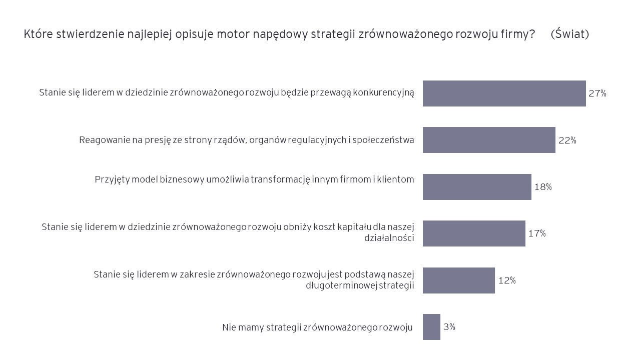 Z badania EY wynika, że CEO w Polsce do wdrożenia zrównoważonego rozwoju w firmach zachęcają czynniki zewnętrzne. Presja państwa, regulatorów i społeczeństwa jest na tyle silna w opinii prezesów, że w ich ocenie stanowić będzie główny powód wprowadzania strategii zrównoważonego rozwoju w biznesie (32%). Za niemal równie istotny prezesi uważają dostosowanie swojego modelu biznesowego w celu wpływania na zmiany u konkurencji i klientów (30%). 20% spodziewa się, że takie działania mogą przynieść wymierne korzyści – obniżenie kosztów kapitału w firmie. 18% jest zdania, iż pozycja lidera zrównoważonego rozwoju umożliwi im pozyskanie przewagi konkurencyjnej. Żaden z przebadanych przez EY prezesów nie uznał, że zrównoważony rozwój jest podstawą długoterminowej strategii rozwoju zarządzanej przez niego firmy.
