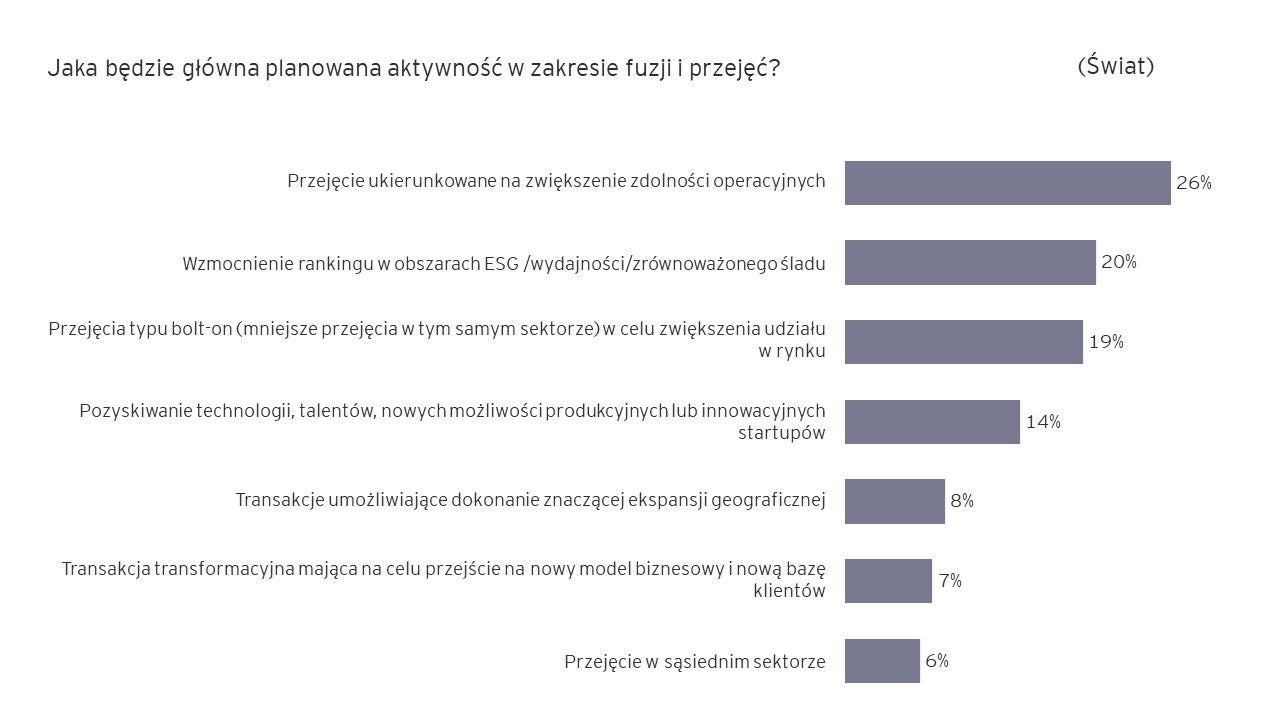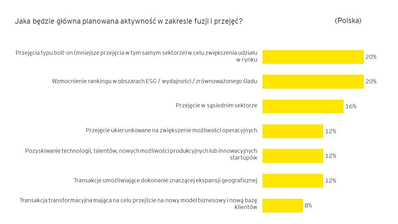 Wśród poszukiwanych przez polskie firmy możliwości transakcji, najczęściej wskazywane są mniejsze przejęcia w ramach tej samej branży w celu zwiększania udziałów (20% ankietowanych). Również 20% prezesów deklaruje zainteresowanie akwizycjami, które mogą pomóc poprawić wskaźniki odpowiedzialności społecznej (ESG), czy ranking środowiskowy.