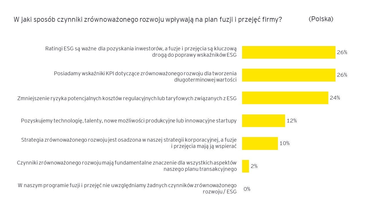 Część rodzimych prezesów ankietowanych przez EY wskazuje czynniki zrównoważonego rozwoju jako powód zainteresowania transakcjami M&A. CEO interesuje przede wszystkim możliwość poprawienia ratingu ESG (26% odpowiedzi), długoterminowa kreacja wartości ze wskaźnikami KPI skoncentrowanymi na zrównoważonym rozwoju (26% wskazań) oraz redukcja ryzyka kosztów związanych z brakiem spełnienia kryteriów ESG (24%).