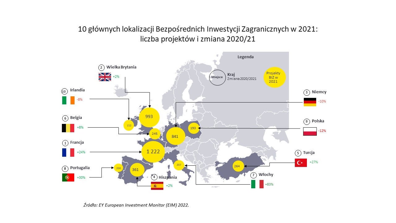 Badanie EY Atrakcyjność inwestycyjna Europy 2022 składa się z dwóch części. Pierwsza to dane ilościowe gromadzone w ramach EY European Investment Monitor (EIM), we współpracy z OCO, o inwestycjach zagranicznych ogłoszonych w Europie w roku 2021, w których efekcie powstają miejsca pracy i otwierane są nowe placówki. W badaniu nie ujęto inwestycji portfelowych oraz fuzji i przejęć. BIZ jest ujęte w zestawieniu jeśli inwestor pozyskuje co najmniej 10-procentowe udziały w firmie oraz bierze udział w zarządzaniu. BIZ obejmuje inwestycje kapitałowe, reinwestowane zyski i pożyczki udzielane w ramach przedsiębiorstwa. Druga część to jakościowe badanie postrzegania Europy przez inwestorów zagranicznych, które zostało przeprowadzone w okresie luty-kwiecień 2022 r. przez agencję Euromoney w formie ankiety internetowej przeprowadzonej wśród reprezentatywnego panelu 501 respondentów – decydentów biznesowych odpowiedzialnych za inwestycje.