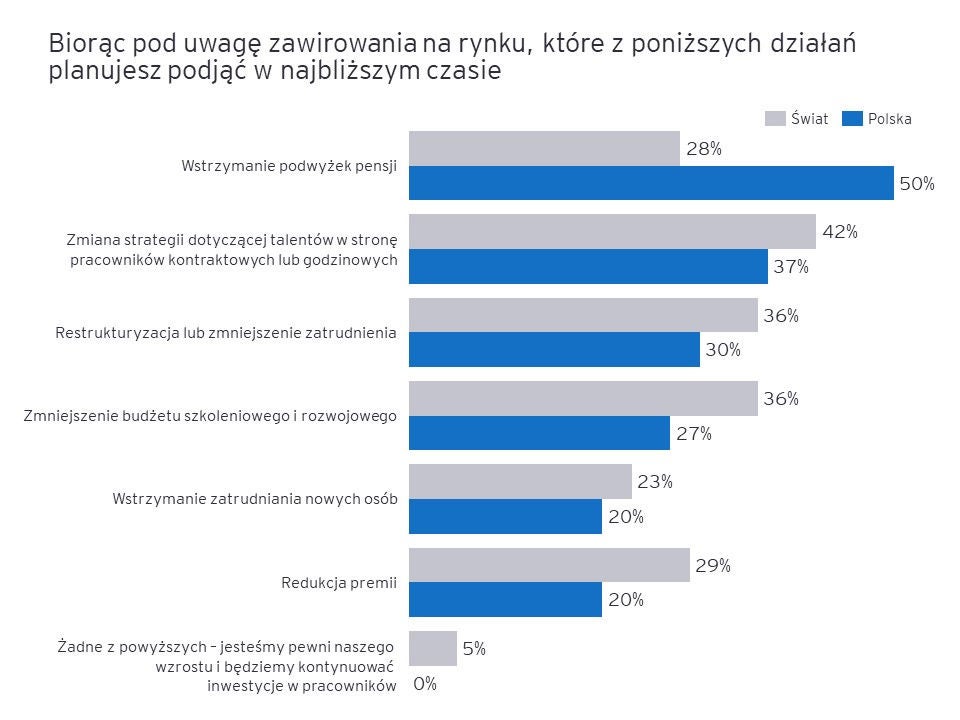 – Jednym z istotnych działań rozważanych przez prezesów w kontekście obserwowanego spowolnienia gospodarczego,  jest ograniczenie wydatków na wynagrodzenia, które do tej pory rosły w Polsce szybciej niż średnio w Unii Europejskiej. Prezesi starają się ograniczać te koszty bardzo ostrożnie i z rozwagą ze względu na napiętą sytuację na rynku pracy, która może utrudnić pozyskanie pracowników w momencie poprawy sytuacji gospodarczej. W miejsce twardej restrukturyzacji CEO, zarówno w Polsce jak i na świecie, coraz częściej wybierają wprowadzanie elastycznych rozwiązań takich jak między innymi zwiększenie zatrudnienia pracowników kontraktowych mówi Paweł Bukowiński, Partner Zarządzający w Dziale Strategia i Transakcje EY, Lider Doradztwa Dezinwestycyjnego w regionie Europy Środkowej, Wschodniej i Południowo-Wschodniej oraz Azji Środkowej (CESA).