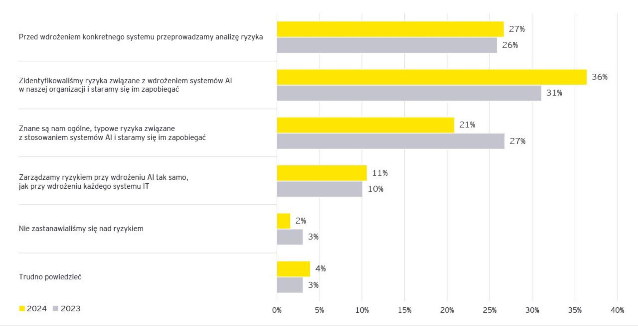 Firmy w Polsce w ramach procesu implementacji AI coraz częściej inwestują w rozwiązania proceduralne (38%, wzrost o 2 pkt. proc) jak i narzędziowe (35%, wzrost o 4 pkt. proc). Równocześnie martwi pozostający na niemal niezmienionym poziomie (19%, spadek o 1 pkt. proc.) odsetek przedsiębiorstw, które zdecydowały się na równoczesne wprowadzenie rozwiązań z obydwu zakresów. Sprawia to, że w wielu organizacjach ochronę ciężko uznać za wystarczającą.