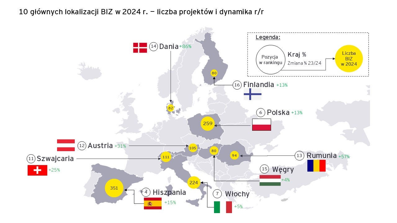 Obszarami, które najmocniej wpłynęły na negatywny wynik na całym kontynencie, były przetwórstwo przemysłowe i usługi biznesowe – oba zanotowały spadek liczby inwestycji o 9% r/r. W przypadku przetwórstwa spadek jest o tyle dotkliwy, że po raz pierwszy od ponad 15 lat inwestycje typu „greenfield” stanowią poniżej 1/3 projektów (spadek o 20% r/r), a liczba miejsc pracy wygenerowanych przez planowane BIZ to 113 179 – o 25% mniej niż w 2023. Negatywny wynik zanotowały też inwestycje w obszarze sprzedaży i marketingu (-2% r/r) oraz logistyka (-6% r/r). W 2024 r. zanotowano natomiast wzrost w kwestii inwestycji dotyczących R&D (3% r/r) oraz budowy siedzib (13% r/r).