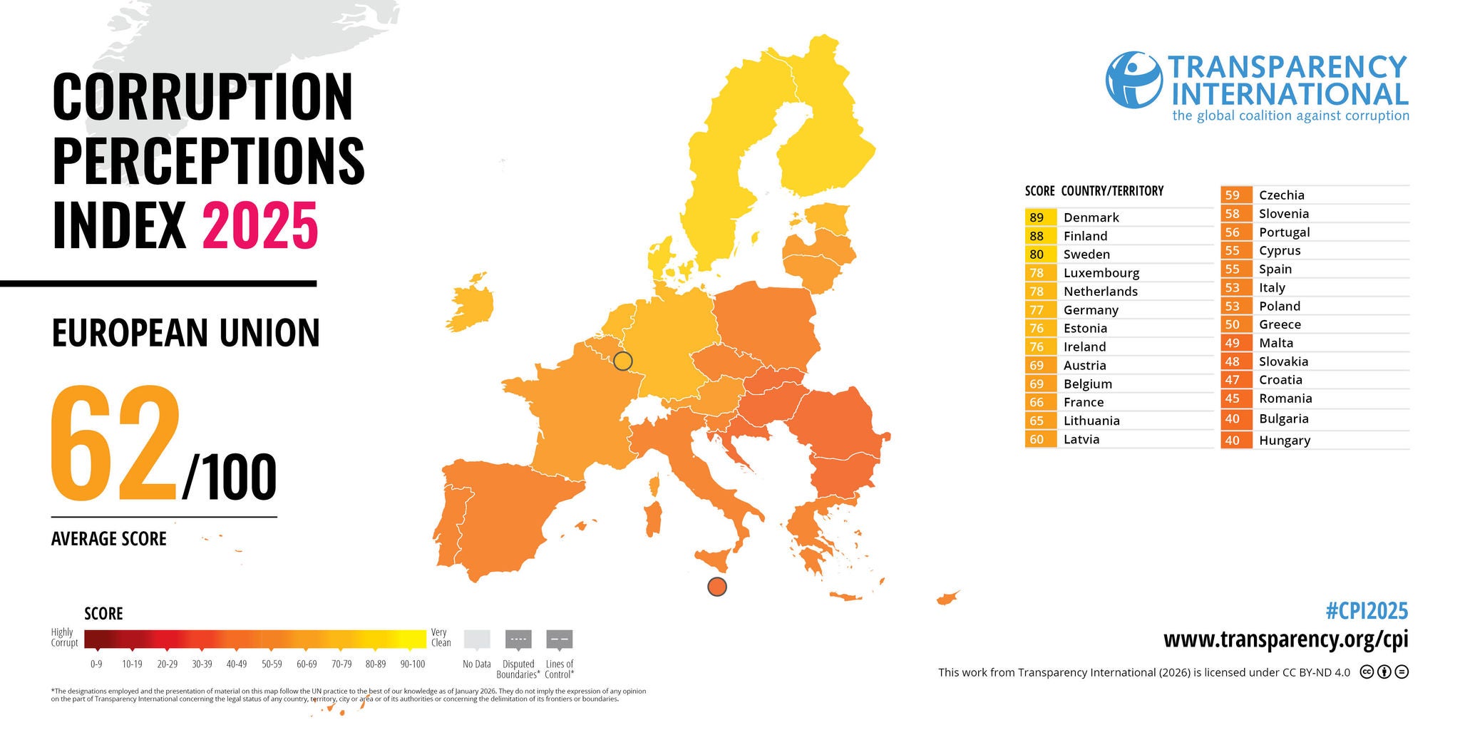 Liderami, podobnie jak w zeszłym roku, pozostają Dania (89), Finlandia (88) i Singapur (84). Zestawienie zamykają Somalia i Sudan Południowy (po 9 pkt) oraz Wenezuela (10). W tegorocznej edycji żaden kraj nie przekroczył progu 90 punktów, a jedynie pięć państw zdołało uzyskać wynik powyżej 80 – dziesięć lat temu takich krajów było dwanaście, co obrazuje niekorzystny, długofalowy trend.