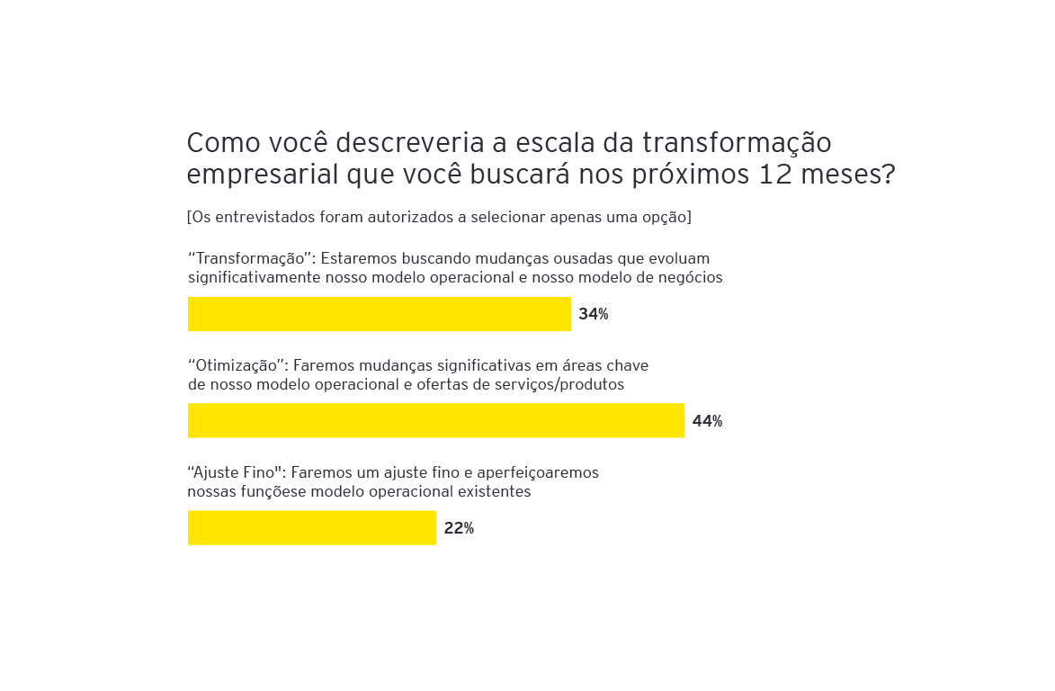 Quando perguntados sobre sua abordagem em relação à transformação do portfólio, abrangendo aquisições, desinvestimentos e cisões, 32% afirmaram que, para os próximos 12 meses, planeja aumentar o nível de mudança transformacional e 44% deseja manter os atuais níveis de transformação (28%). Dos 72% dos entrevistados que aceleram ou mantêm os níveis atuais de transformação da carteira, a principal fonte de transformação virá da melhoria do desempenho (68%).