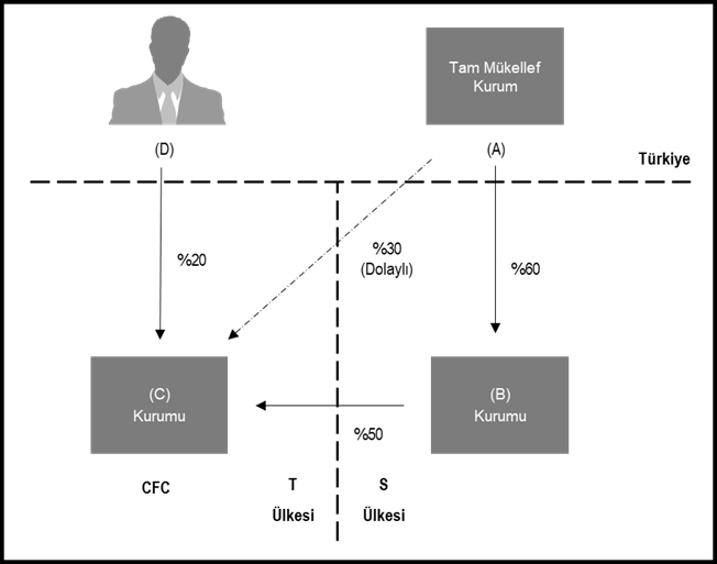 [4] Yukarıda yer alan şekilde, Türkiye mukimi (A) Kurumu ve gerçek kişi (D)’nin, (C) Kurumuna toplam iştirak oranı %50 olduğundan (C) Kurumu, diğer şartların da gerçekleşmesi halinde KEYK olarak değerlendirilecektir.