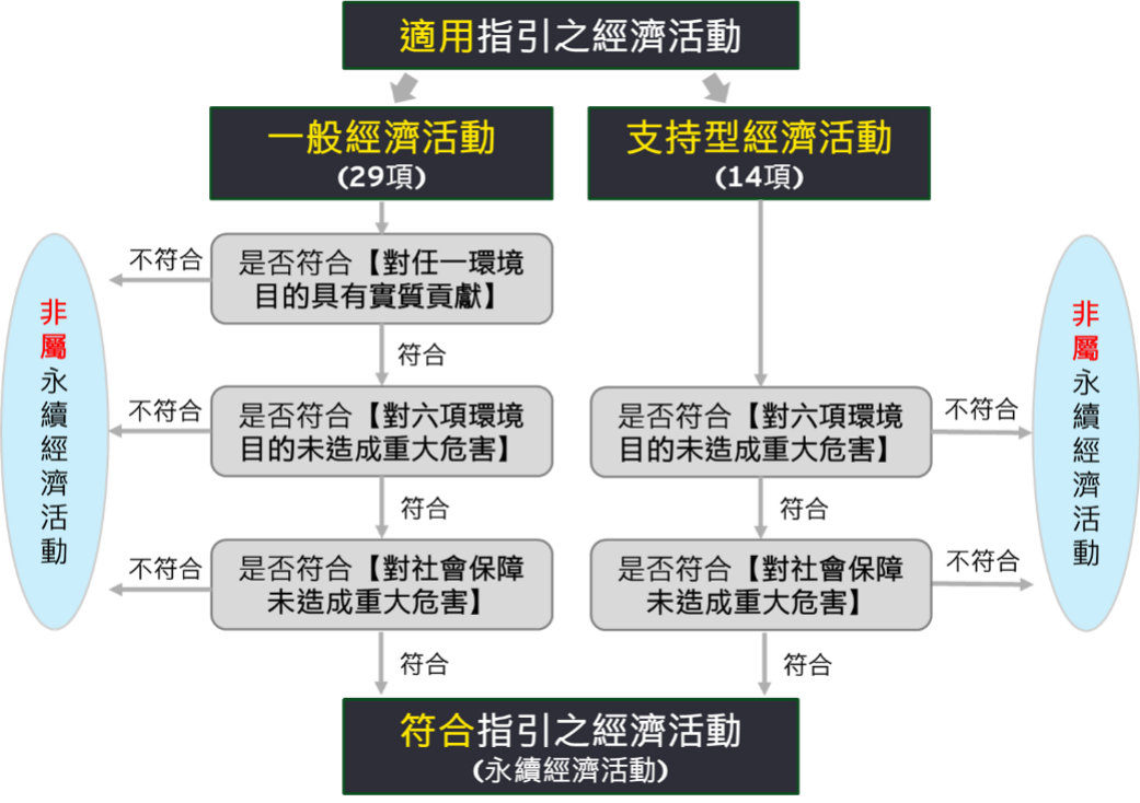 適用新版指引之經濟活動分為二類:「一般經濟活動」及「支持型經濟活動」,企業衡量營運之主要經濟活動或專案項目符合情形之方式如下圖1: