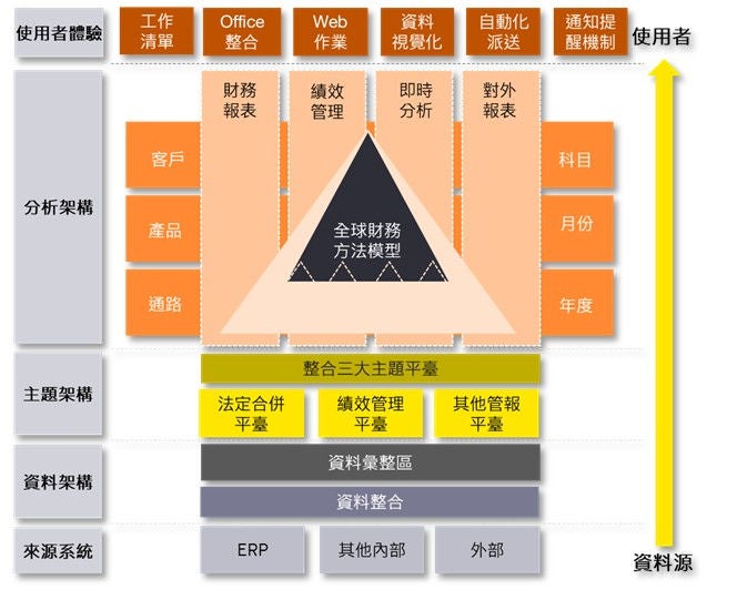 當企業已完善規劃EPM相關作業流程,可進一步評估導入資訊工具以提升整體效能。企業應建構財務與非財務資訊整合平臺(圖5),透過以下功能實現即時、準確且具洞察力的績效管理: