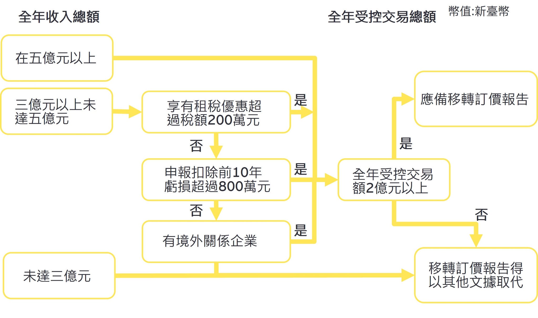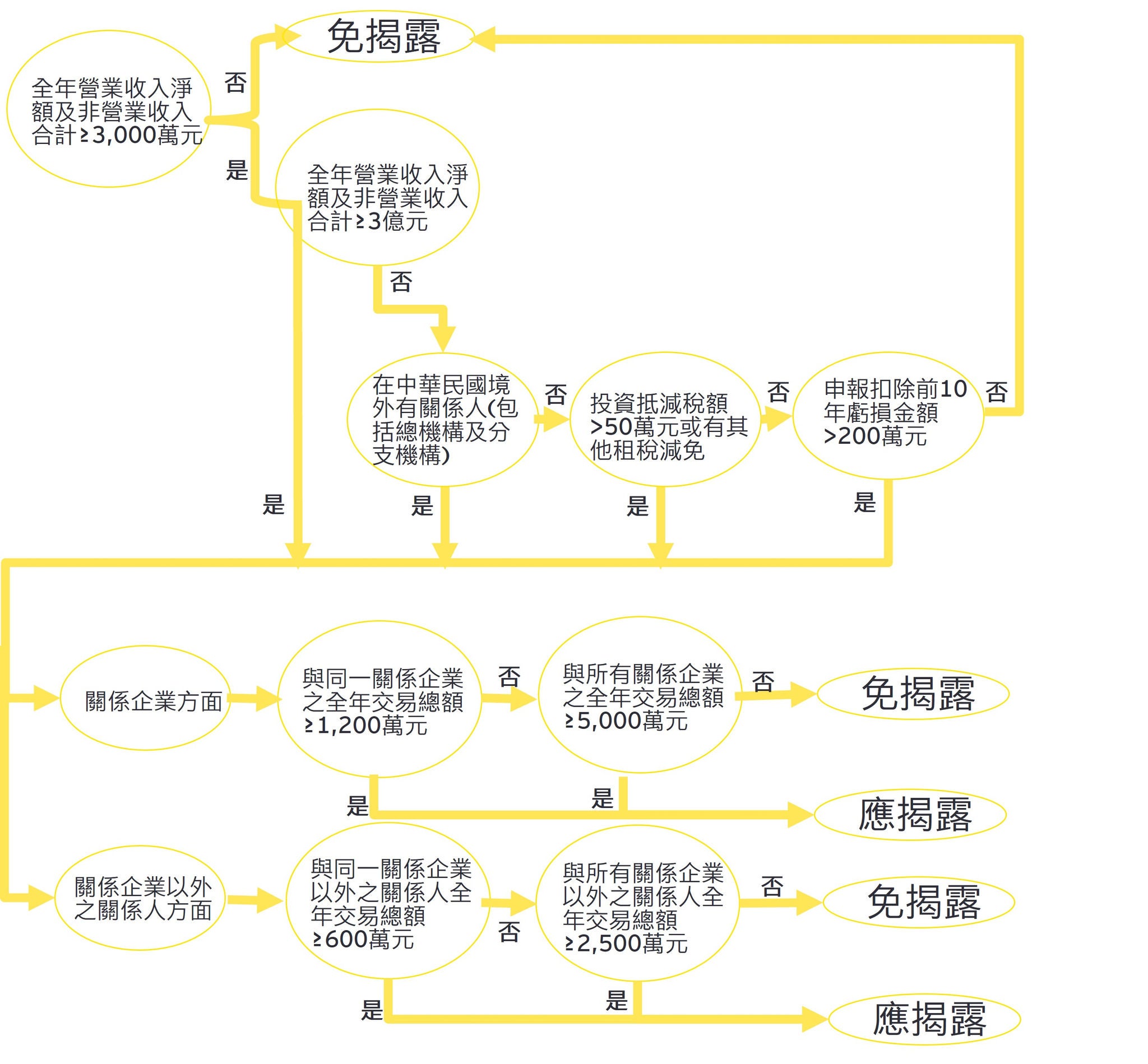 在新臺幣 3 千萬元以上,且有下列情形之一者,應依營利事業所得稅不合常規移轉訂價查核準則(以下簡稱移轉訂價查核準則)第 21 條規定,揭露符合第二點規定之關係人及關係人交易之資料: