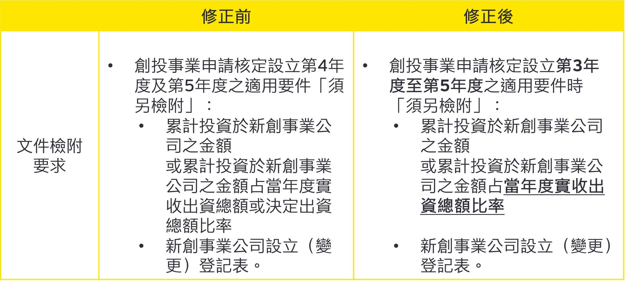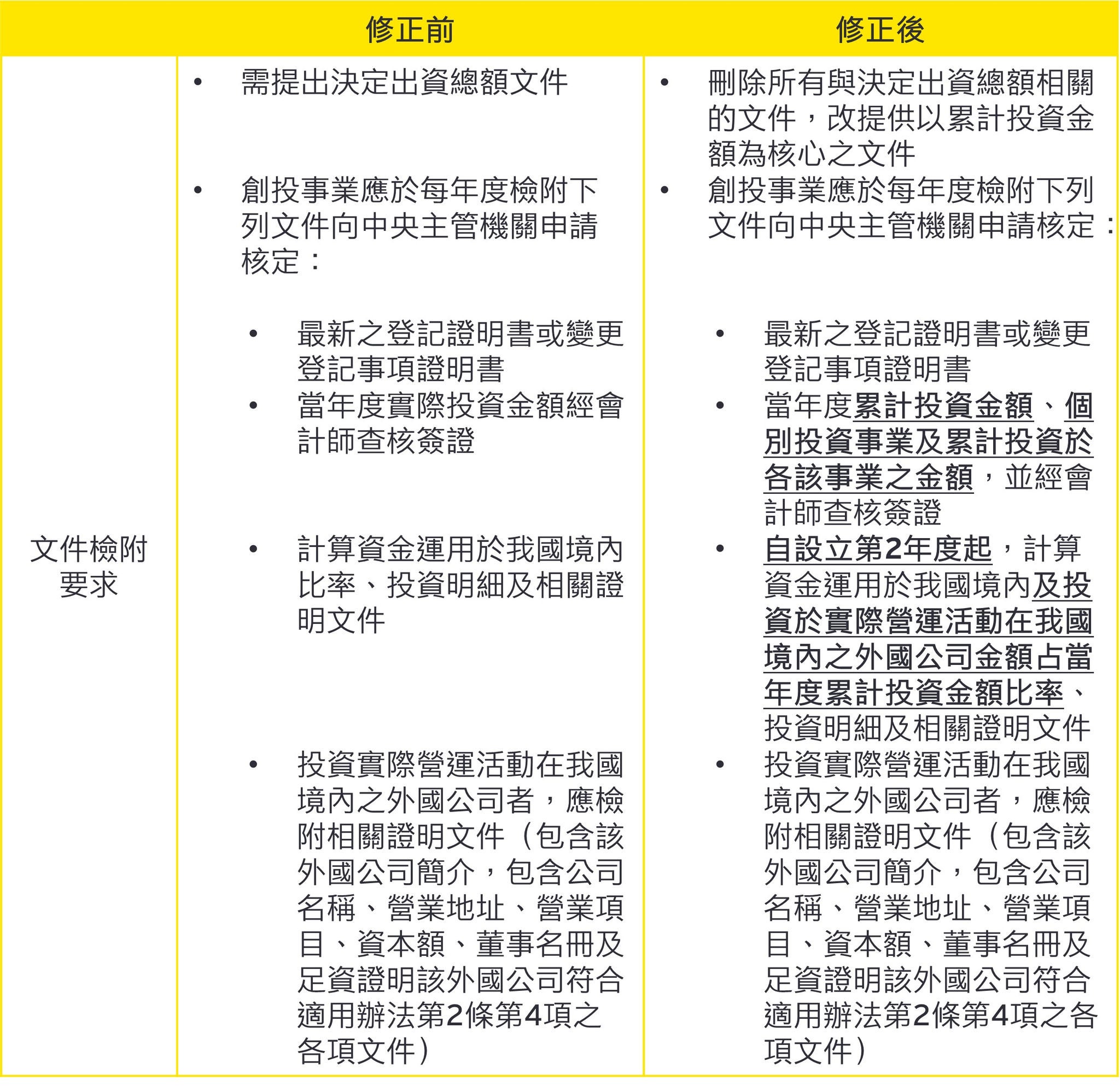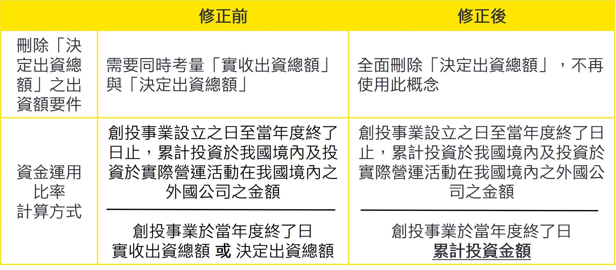 而投資新創事業之比率計算,則以創業投資事業設立之日至當年度終了日止,累計投資於我國境內及投資於實際營運活動在我國境內之外國公司之金額,除以創業投資事業於當年度終了日累計投資金額,其比率應達50%。除此之外,為配合《產創條例》之修正,其相應之適用辦法亦完成必要之調整,使整體規範更為一致且具操作性。